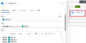条件を満たした場合、Office 365の「メールの送信 (V2)」アクションを使います。ここで、契約名・期限日・担当者を本文に差し込みます。
