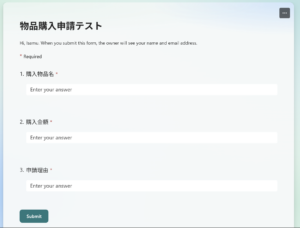 今回作成した物品購入申請のFormsは以下。設問を3つ設けています。