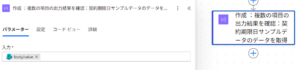 body/value → リスト全件が入った配列Title → 契約名期限日 → 契約の有効期限(UTC形式 → 日本時間に変換)担当者メール → 契約管理担当者※その他のキー({Name}や{FilenameWithExtension})は通常不要です。